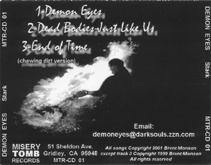 The DEMOn That LIVEs Within (live) Stark 2. You Better Tell Me Now 2:09 3.Waves of Hatred 3:16 4. There Can Be Only One 4:22 5. Demon Love 7:39 6. Sex With a Zombie 1:22 7. End of Time 4:34 8. Future Memories 3:58 9. I Felt Like Dying 12:10 Design: Brent Monson, Jules Alcouffe 2. There Can Be Only One 4:29 3. Faster Fist Fuck 2:33 4. Nothing But Your Death 7:48 5. I Am All of You 4:20 6. Waves of Hatred 3:27 7. Just a Little Black Today 7:05 8. Terminal Existance 5:12 Jim Boots: Drums Brent Monson: Guitars, Vocals James Secrist: Vocals Design: Jules Alcouffe, Brent Monson 2. Dead Bodies (Just Like Us) 3:33 3. End of Time (Chewing Dirt Version) 4:19 Brent Monson: Guitars, Vocals, Bass James Secrist: Vocals Song 3 ©1999 Brent Monson |