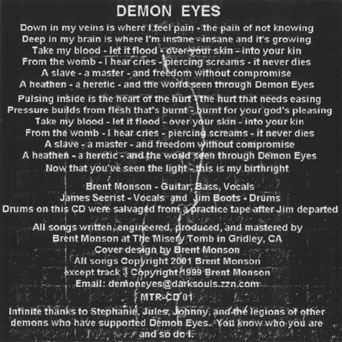The DEMOn That LIVEs Within (live) Stark 2. You Better Tell Me Now 2:09 3.Waves of Hatred 3:16 4. There Can Be Only One 4:22 5. Demon Love 7:39 6. Sex With a Zombie 1:22 7. End of Time 4:34 8. Future Memories 3:58 9. I Felt Like Dying 12:10 Design: Brent Monson, Jules Alcouffe 2. There Can Be Only One 4:29 3. Faster Fist Fuck 2:33 4. Nothing But Your Death 7:48 5. I Am All of You 4:20 6. Waves of Hatred 3:27 7. Just a Little Black Today 7:05 8. Terminal Existance 5:12 Jim Boots: Drums Brent Monson: Guitars, Vocals James Secrist: Vocals Design: Jules Alcouffe, Brent Monson 2. Dead Bodies (Just Like Us) 3:33 3. End of Time (Chewing Dirt Version) 4:19 Brent Monson: Guitars, Vocals, Bass James Secrist: Vocals Song 3 ©1999 Brent Monson |
